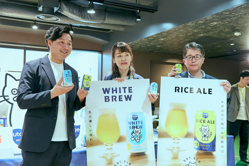 あぐラボで10日に開催された発表会では、Sustainable AgriTech & FoodTechクラスターにおけるスタートアップと企業の共創事例として、Beer the Firstによるアップサイクルビールの新商品公開も実施しました。株式会社明治の乳素材を活用した「WHITE BREW(ホワイトブリュー)」と、尾西食品株式会社のアルファ米の端材を使用した「RICE ALE(ライスエール)」の2商品です。いずれも、原料の背景にあるストーリーと味わいの両立を目指して開発された、サステナブルなクラフトビールです。